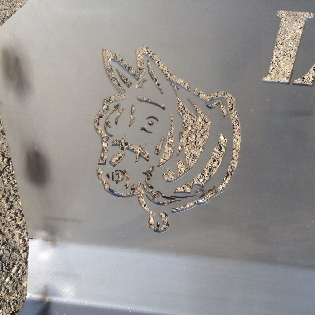 "Horse" Emblem on "Lloyd & Arlene Hardlock" Stainless Steel Memorial Bench Leg
