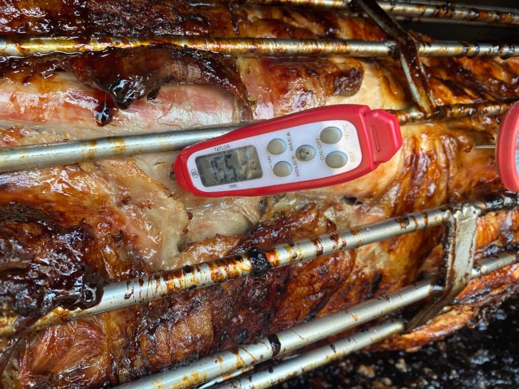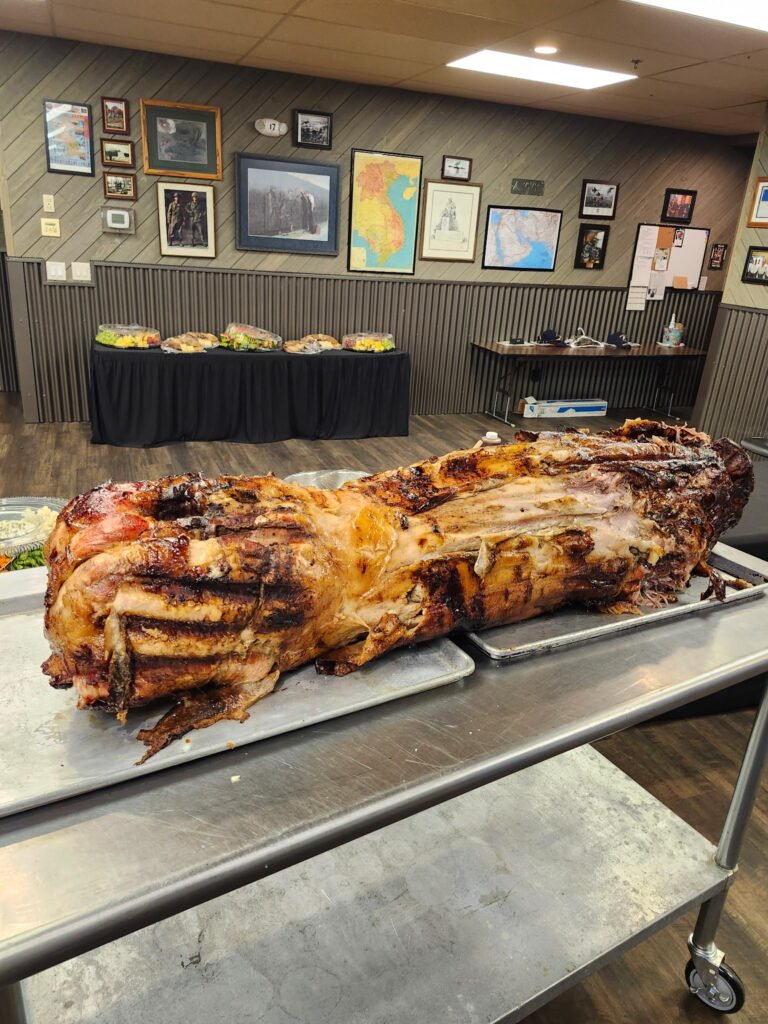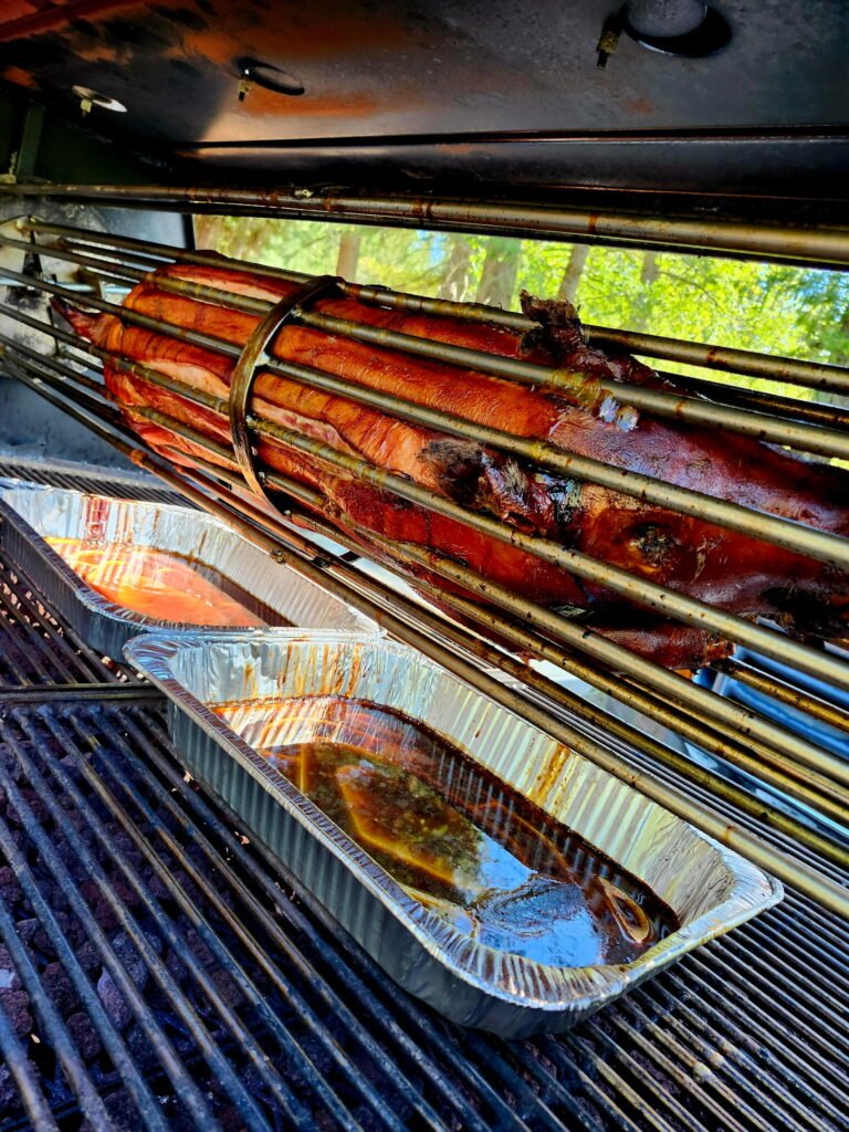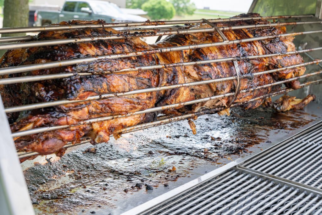 A Hog After Being Cooked with the Rotisserie on a Towable Grill