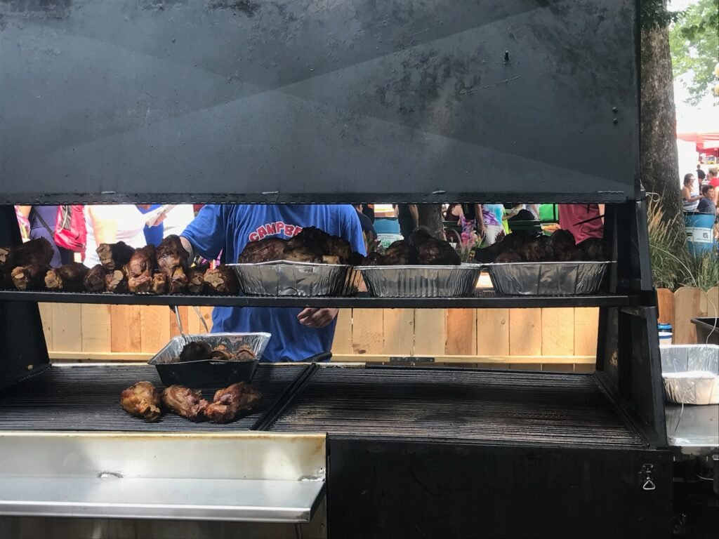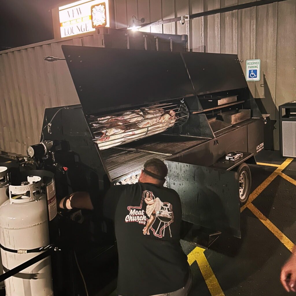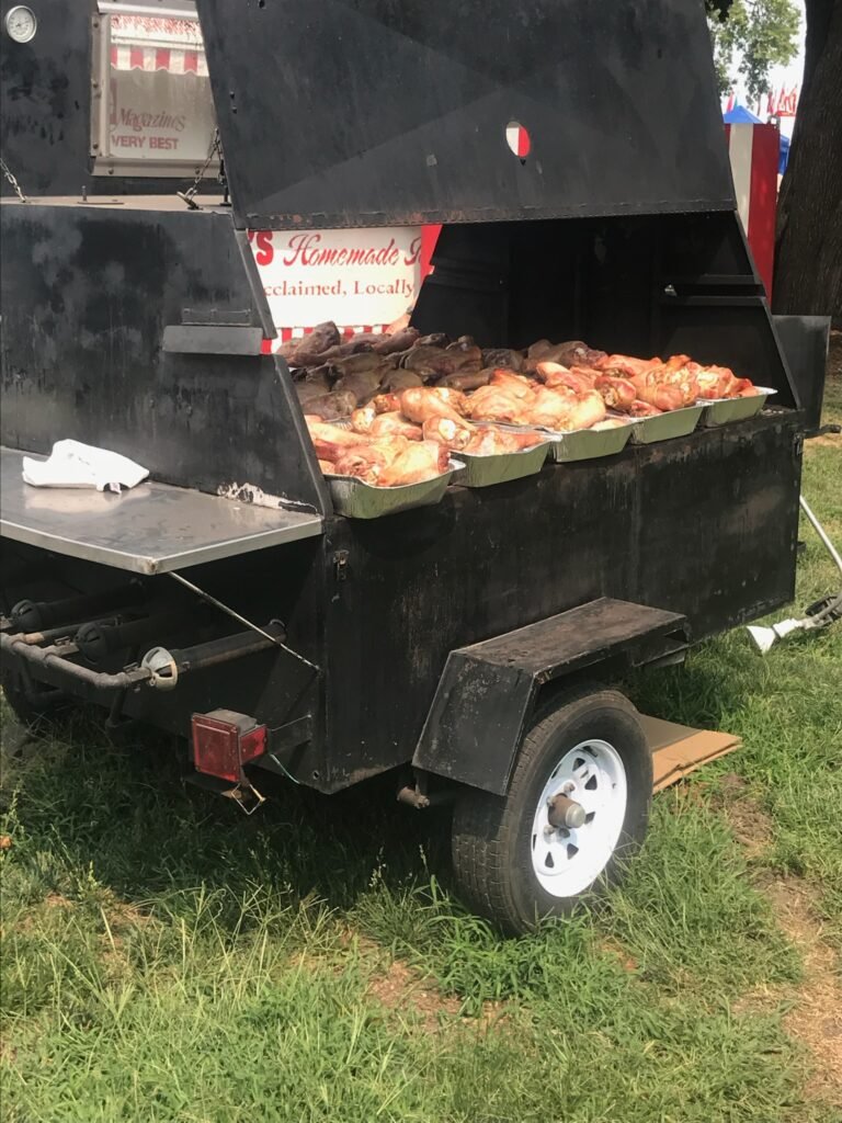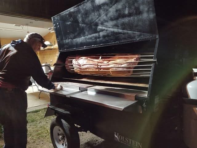 Hog Being Cooked in a Rotisserie on a Towable Grill